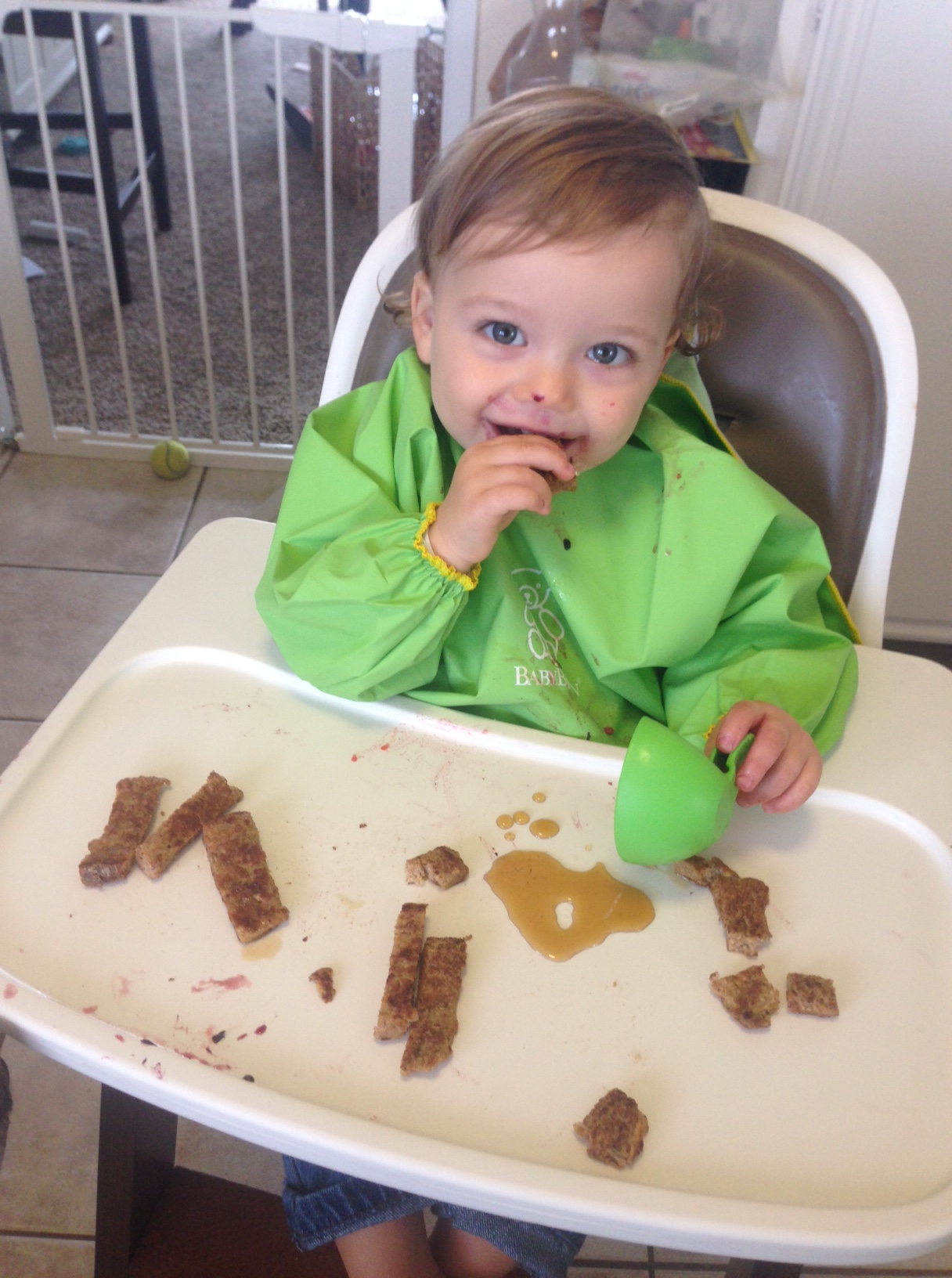 This morning I wanted to make him healthy french toast for something different. I thought cutting it in strips and giving him a side of syrup to dip it in would keep him entertained long enough for me to enjoy some too…it worked, kind of. He ended up throwing the strips at the dogs because he thought they looked funny catching them. So I resorted to cutting them back into bits and cooking him scrambled eggs as well. The side of syrup obviously ended up on the floor. Thank goodness for two labs and big a** tongues who moped my floor for me.