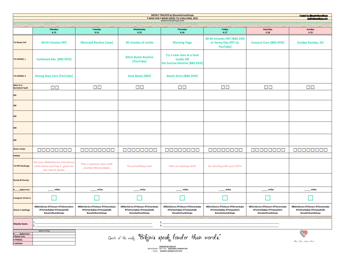 H A P P Y B I K I N I S E R I E S !!! I am head over heels in love with TIU’s new formatting for Bikini Series; their 8-week plan with everything laid out is beautifully formatted; I’m a font freak and am obsessed with their fonts …